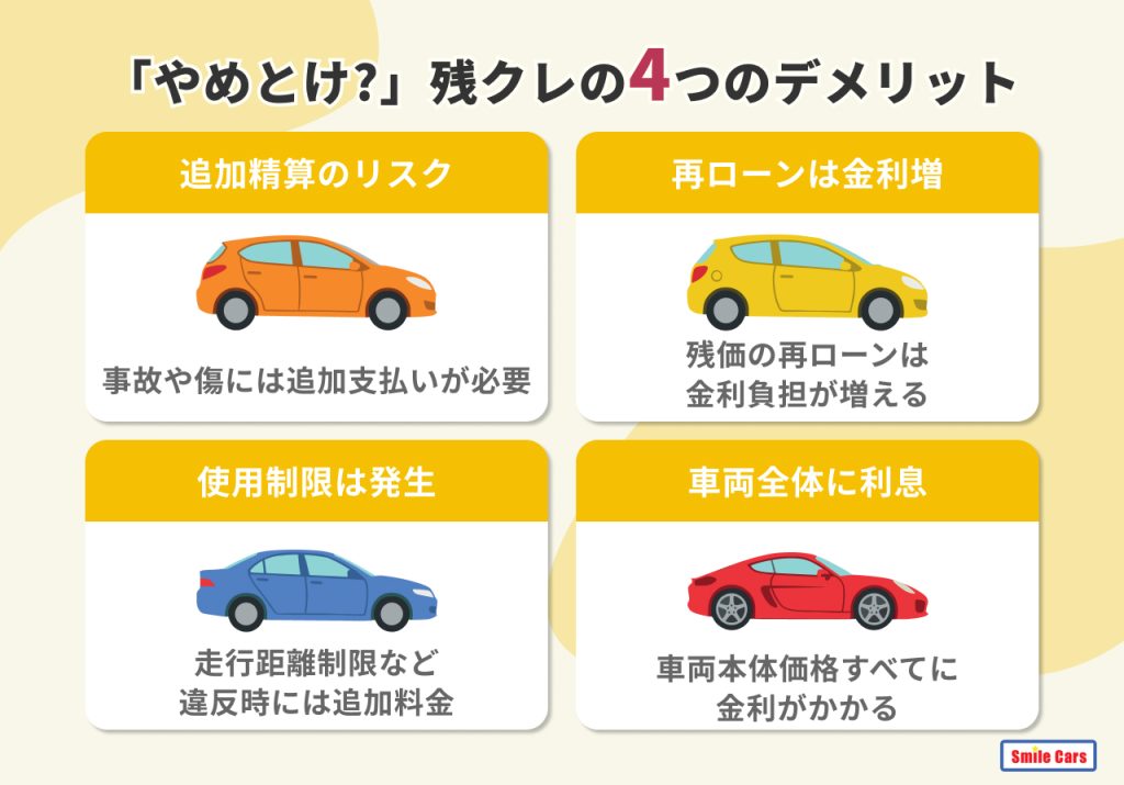 ここでは、ディーラーの営業担当者からはなかなか聞きづらい、残クレの4つのデメリットについて詳しく解説していきます。