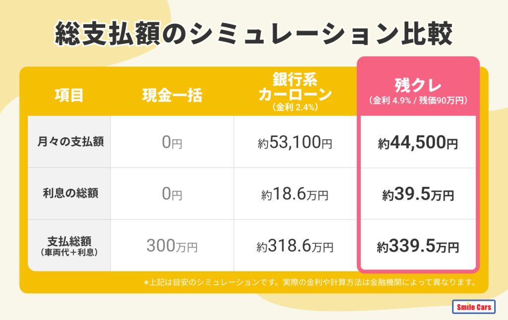 | 支払総額(車両代+利息) | 300万円 | 約318.6万円 | 約339.5万円 |