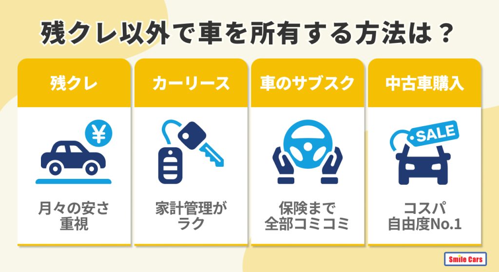 しかし、月々の支払いを抑えながら車に乗る方法は、残クレ以外にも存在します。
